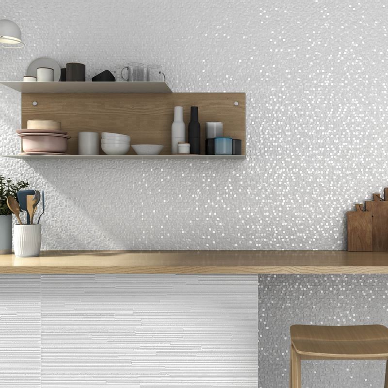 Este cerámico tipo mayólica Mos Hit 25x75 ofrece un diseño geométrico moderno sobre fondo blanco con textura ligera. Ideal para muros de baño o cocina, su formato rectangular permite lograr efectos visuales atractivos y actuales.